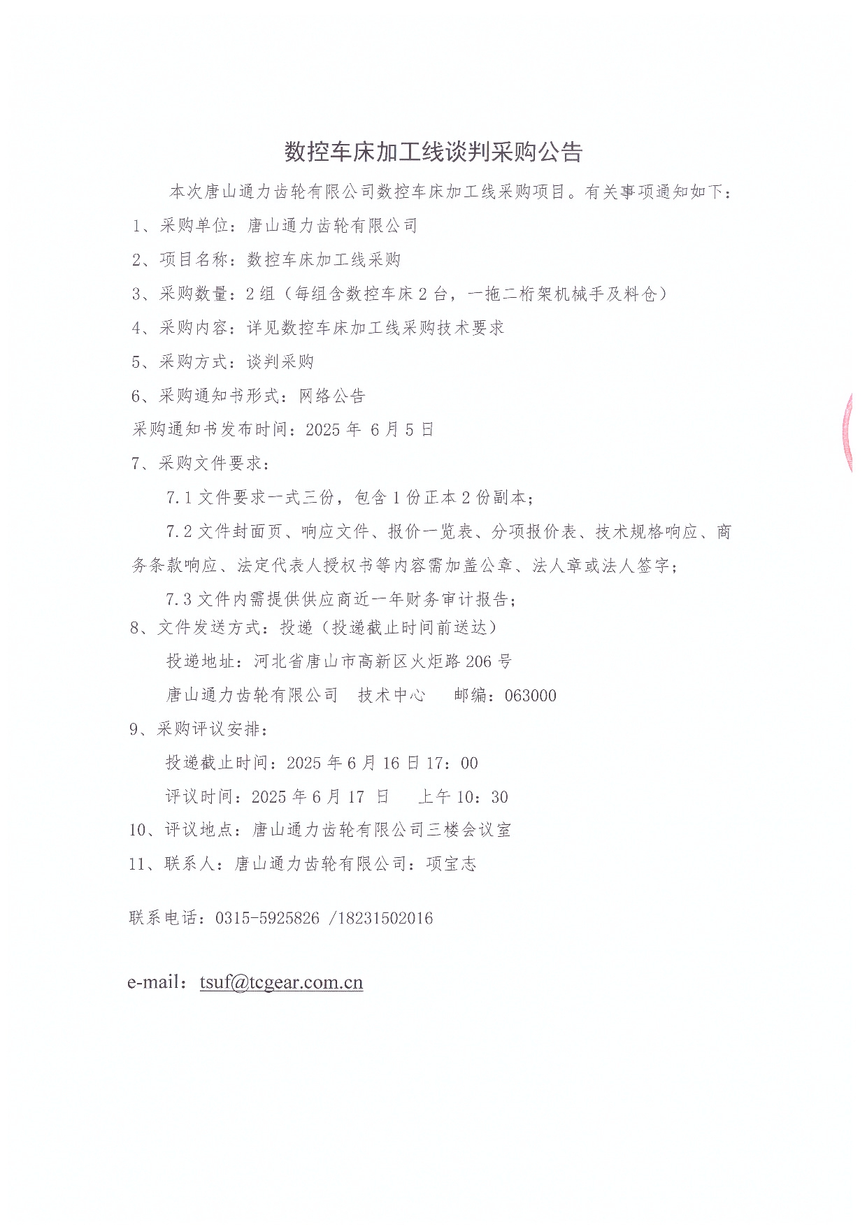唐山通力齿轮有限公司 数控车床加工线谈判采购公告
