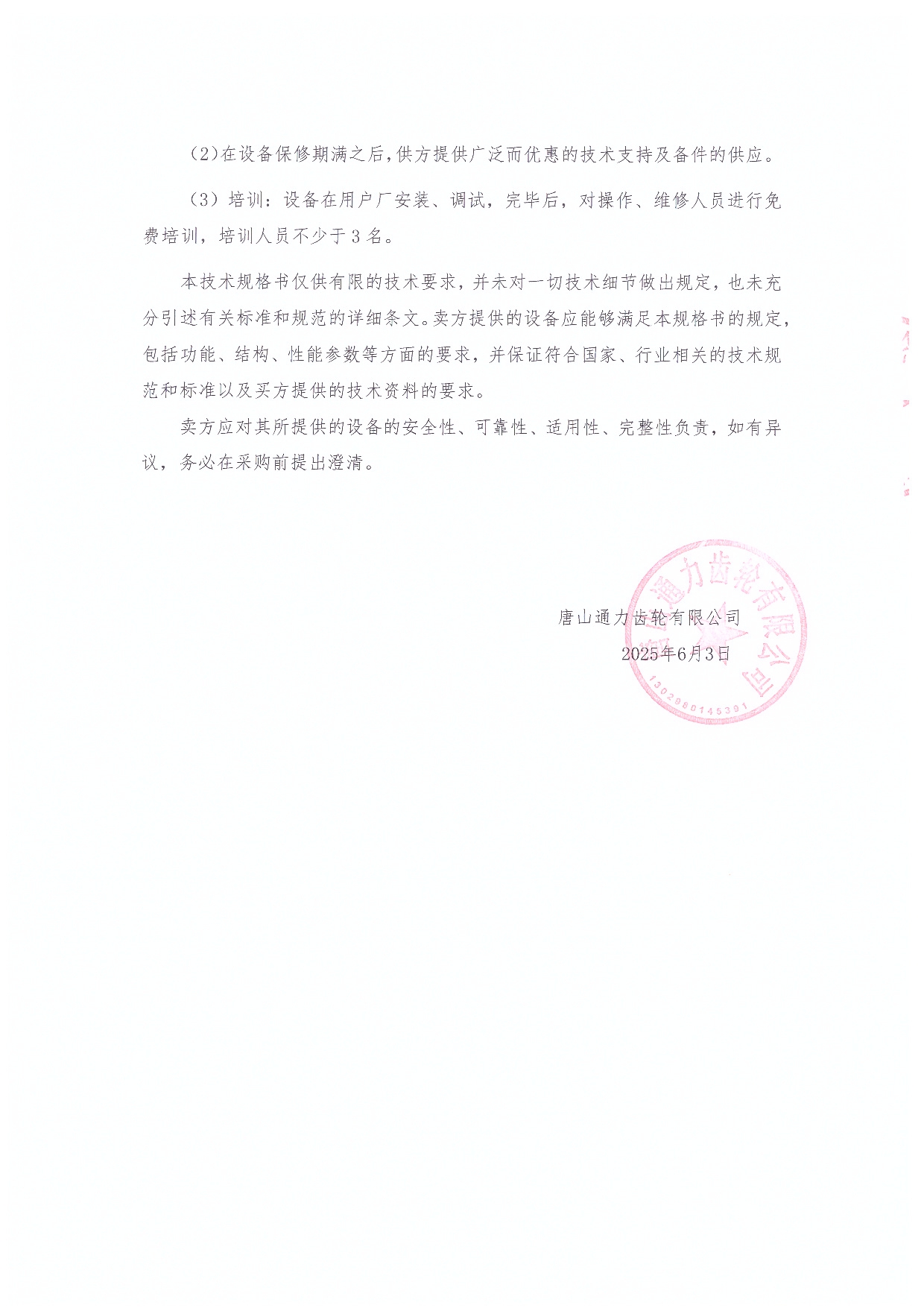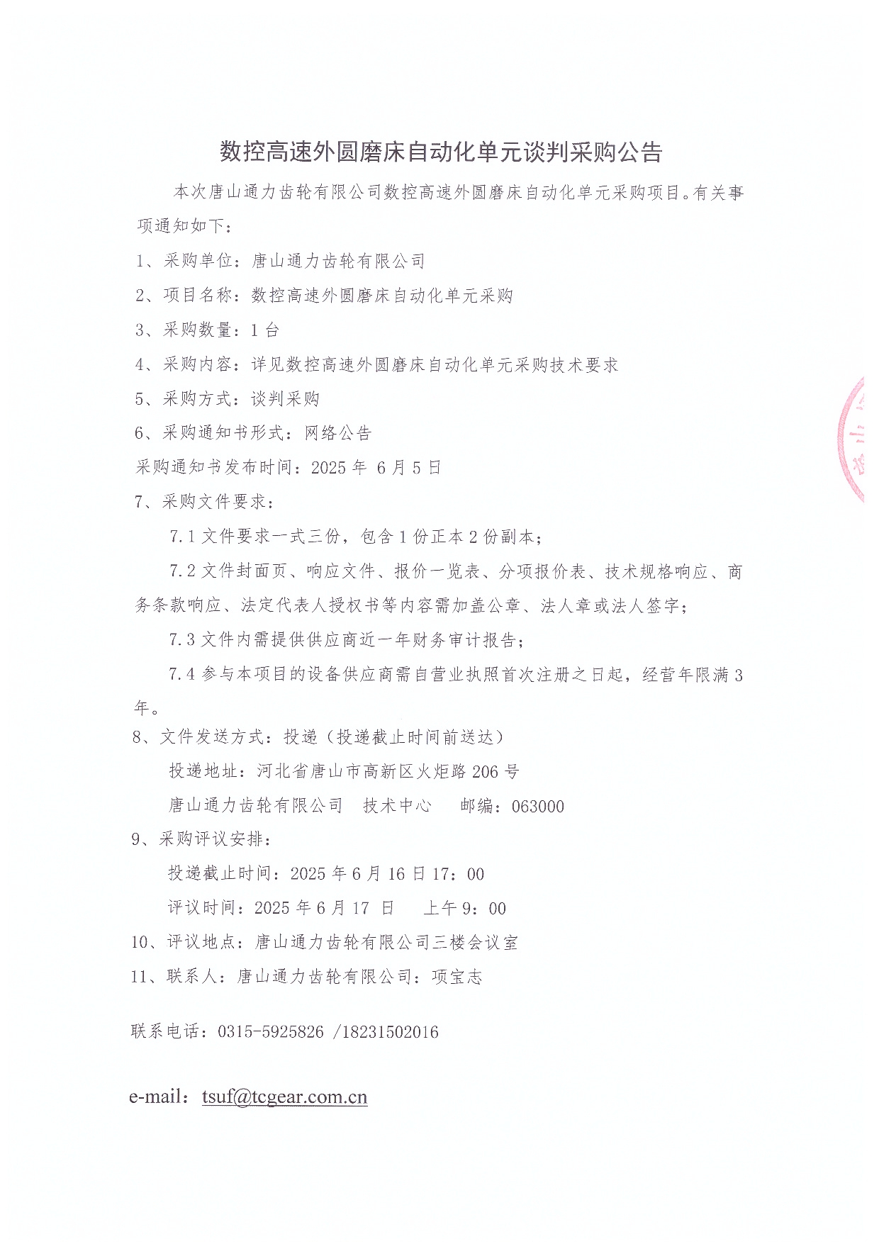 唐山通力齿轮有限公司 数控高速外圆磨床自动化单元谈判采购公告